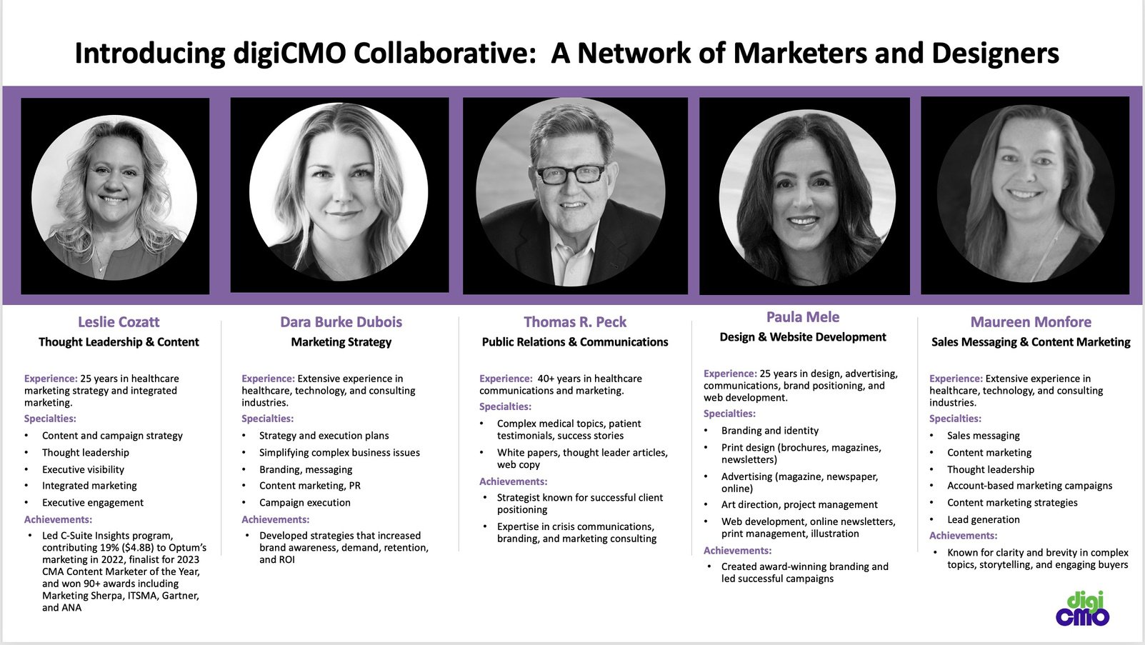 DigiCMO Collaborative Difference: We provide both strategic insight AND hands-on execution. Our team-based approach gives you access to diverse expertise, ensuring comprehensive support across all aspects of healthcare marketing.